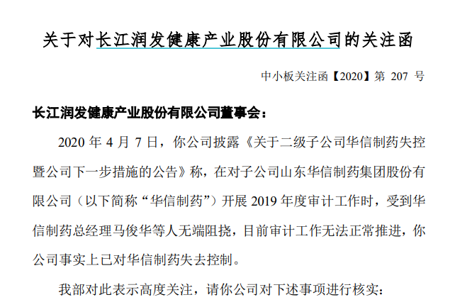近日,长江健康发布公告称,在事实上对二级子公司华信制药失去控制。长江健康年报工作组进驻后,华信制药两名原股东“煽动相关人员无端围堵围攻审计工作人员”,致使部分审计人员人身安全受到威胁,甚至在当地领导出面协调的情况下仍无效果。对此,深交所迅速下发问询函,要求其对子公司失控的相关事项予以核实。
